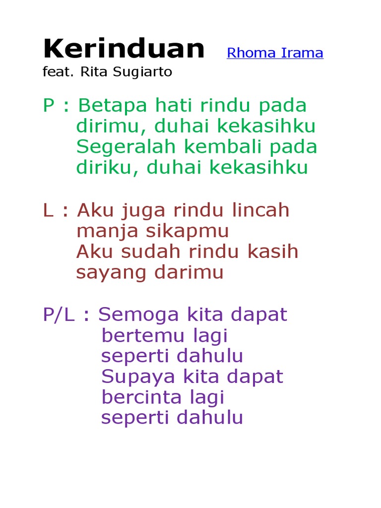 Aku sudah rindu lincah manja sikapmu aku sangat rindu kasih sayang darimu. Lirik Lagu Rindu - Meggy Z. Rhoma Irama featuring Rita Sugiarto sungguh paripurna membawakan alunan lagu berjudul.